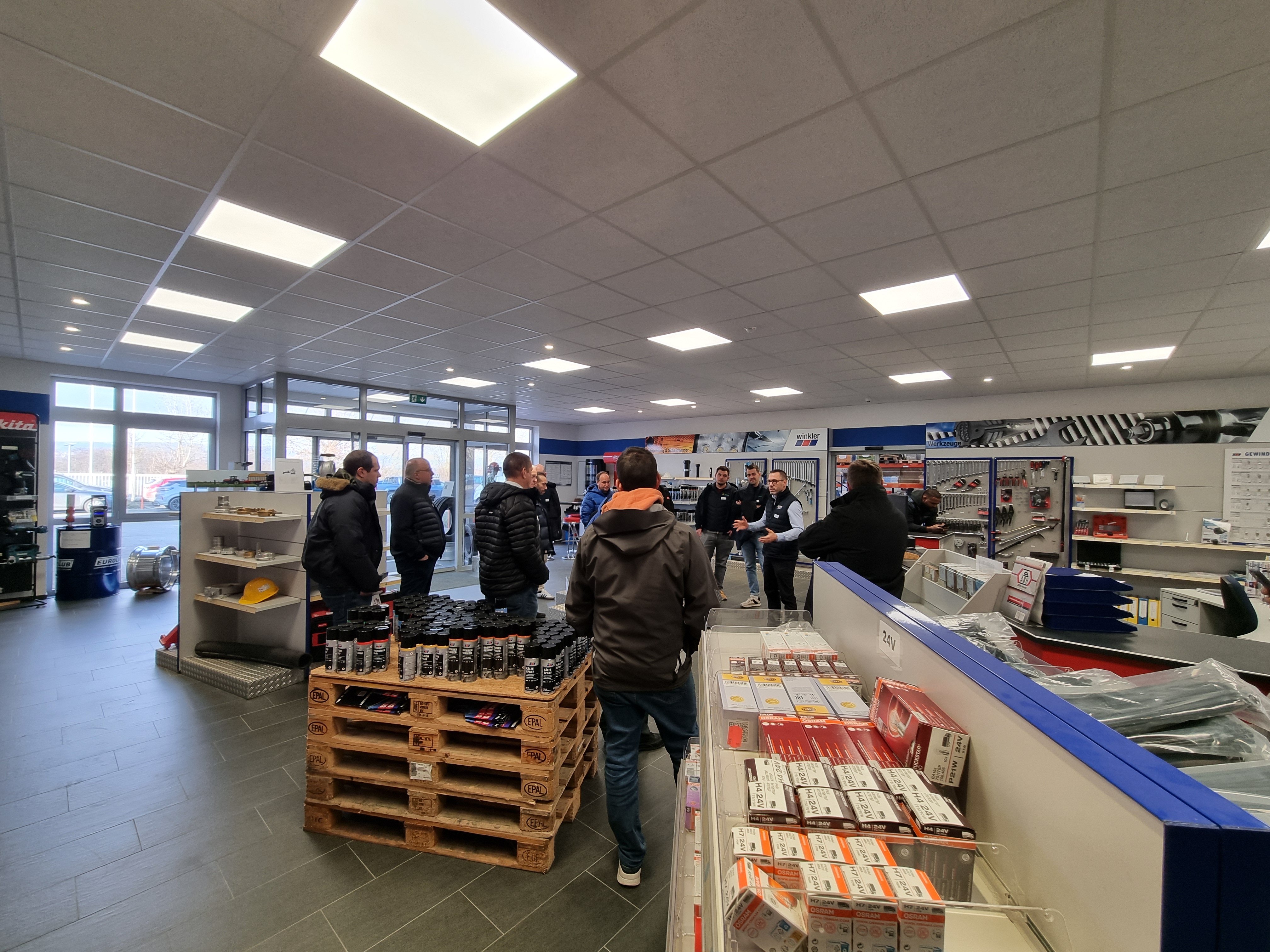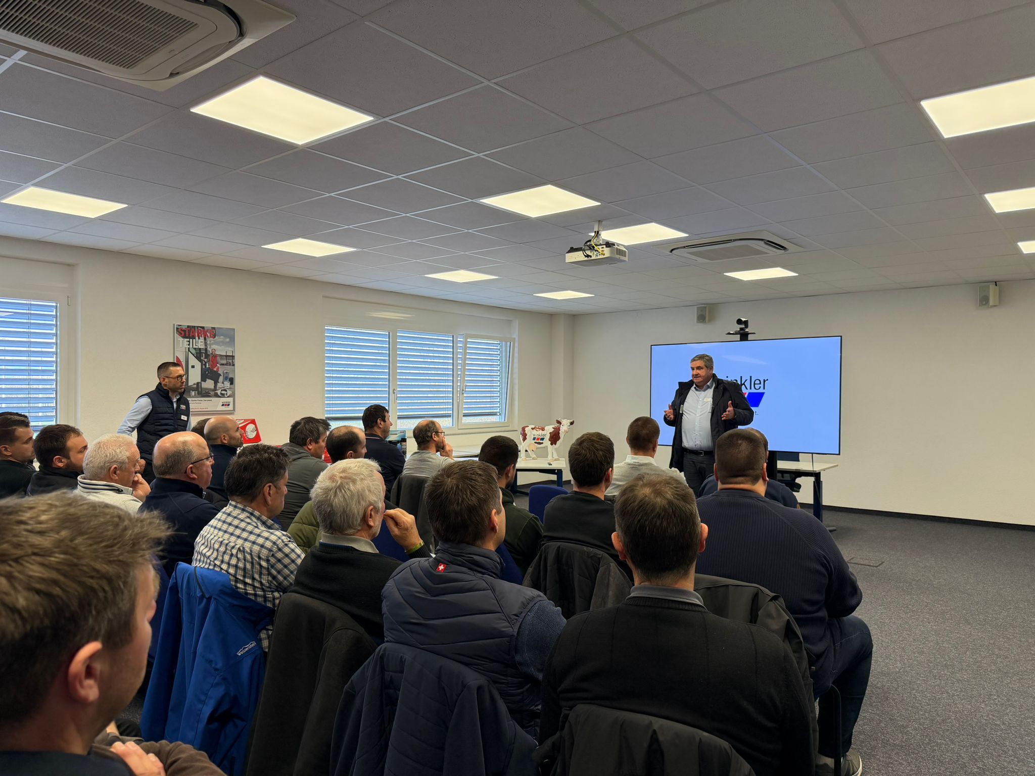 Marco Furfaro, Verkaufsleiter Schweiz, und Tobias Hostettler, Betriebsleiter Etagnières, führten durch den Vormittag, gaben Einblick in die aktuellen Herausforderungen der Ersatzteilbeschaffung und zeigten das Lager vor Ort.
