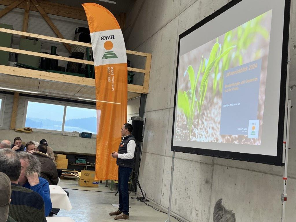 Dans sa rétrospective annuelle, Beat Wyss, conseiller en culture KWS, a décrit devant 160 invités les défis et les succès de l'année écoulée : les protestations des agriculteurs, les conditions météorologiques difficiles, les semis en retard et le résultat réjouissant de la votation sur l'initiative biodiversité ont marqué l'année du point de vue agricole. La récolte de maïs a obtenu de bons résultats, tandis que la production de betteraves sucrières a été fortement mise à contribution par la propagation du virus SBR et d'autres maladies comme la cercosporiose. La menace du système de notification Digiflux inquiète en outre le secteur.