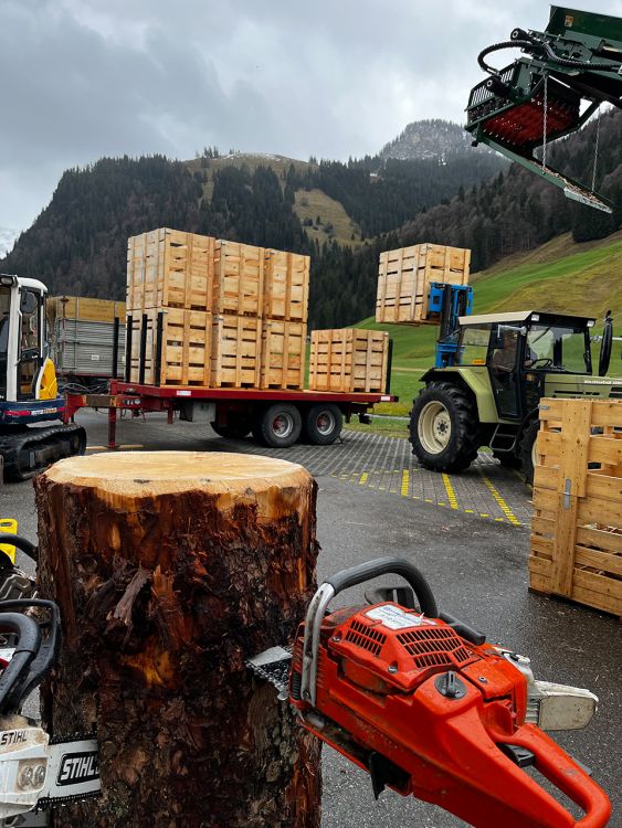 C’est correct. En hiver, on va à la forêt pour s’occuper du débardage, de l’abattage jusqu’à la coupe du bois de chauffage. Pendant la saison d’été, c.-à-d. pendant la période d’avril à début novembre, nous proposons tous les travaux du domaine des pâturages : Service de fauchage, pressage de balles à ensiler. Nous remplissons des silos horizontaux et des silos-tours. L’épandage d’engrais de ferme à partir de la ferme ou de la bordure de champ fait également partie de notre offre.