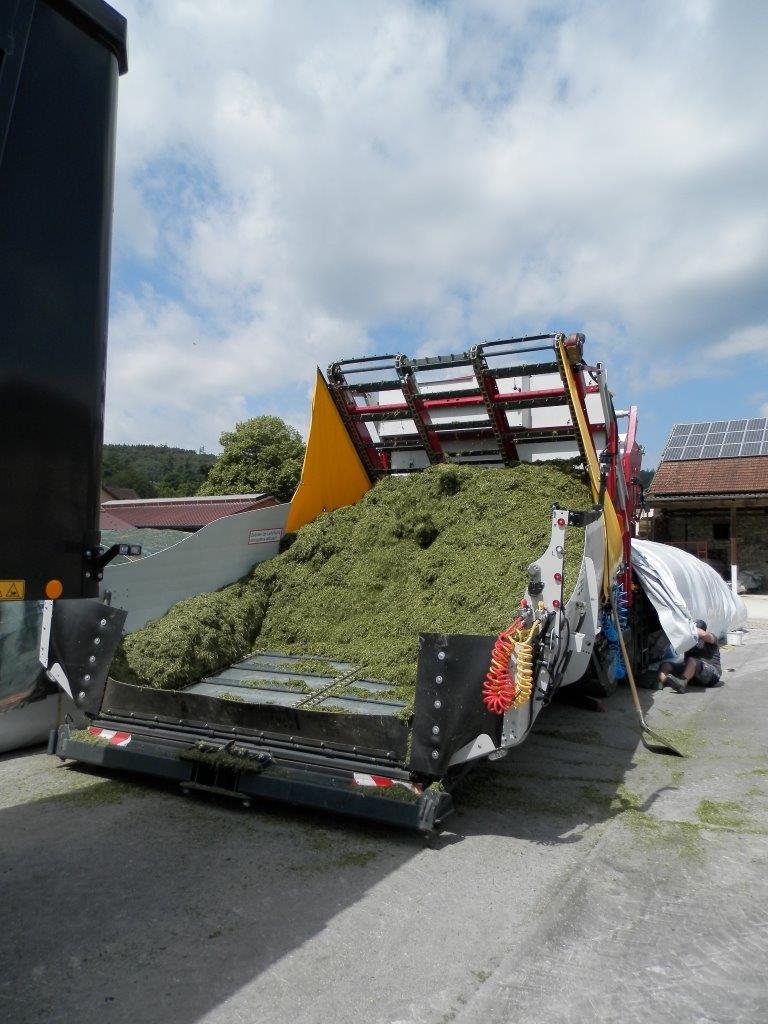 Avec ce procédé, l’entreprise d’Helmut Kugelmann veut assurer une avance correspondante, afin d’éviter une post-fermentation ou un échauffement dans la souche du silo. Les deux véhicules d’apport, un tombereau et une remorque de transport de copeaux étaient ainsi occupés à alimenter en permanence la Silospeed « affamée » ou la trémie de réception de 20 m³. La capacité d’alimentation indiquée de 32 t/h à 66,5 t/h en pointe peut rarement être exploitée avec deux ou trois bennes basculantes utilisées. La trentaine de participants à la démonstration a pu se faire une idée de la fluidité de l’ensilage avec Silospeed : plus besoin de couvrir ni de transporter des sacs d'ensilage. Une pression élevée et un bâchage immédiat donnent un ensilage de très haute qualité du début à la fin.