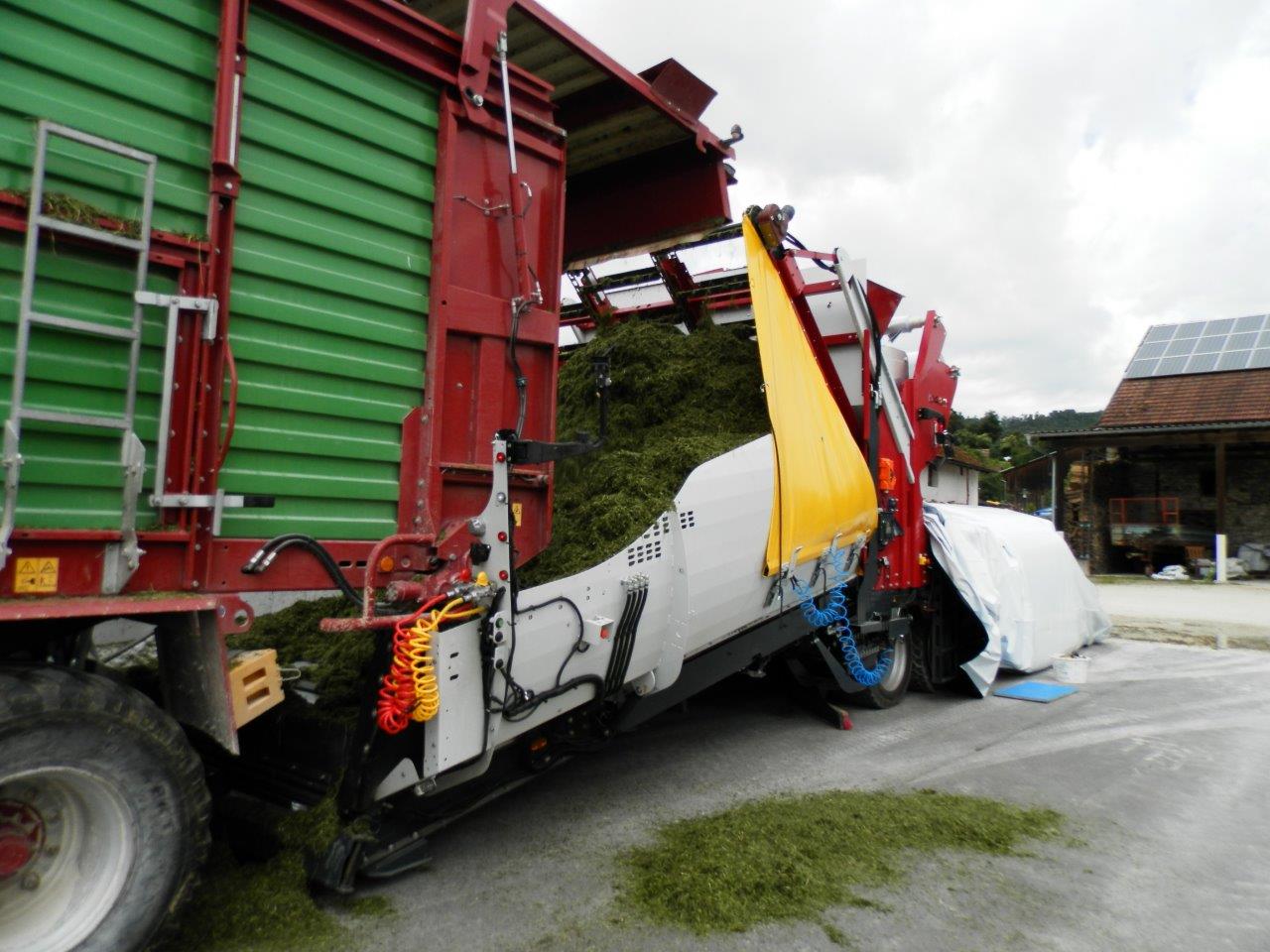 Remplir : Le produit à ensiler est déversé sur la trémie de réception avec un tampon d’environ 20 m³.
