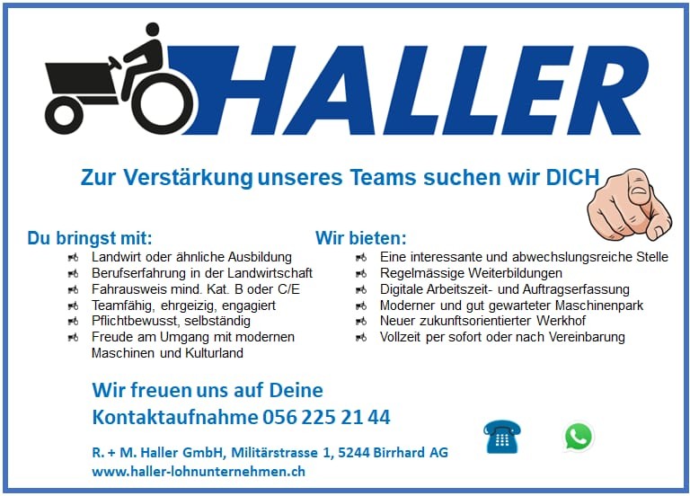 Zur Verstärkung des Teams sucht das Lohnunternehmen R. + M. Haller einen Landwirt EFZ per sofort oder nach Vereinbarung.