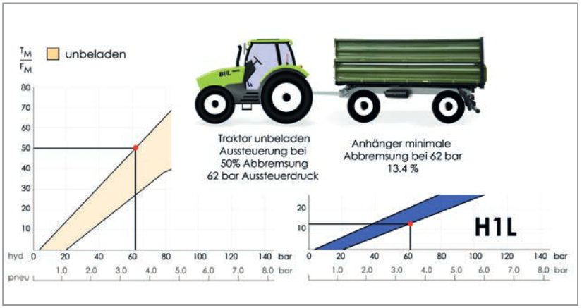 Ein neuer «unbeladener» Traktor bringt bei einem Steuerdruck von ca. 4 bar eine 50-prozentige Abbremsung, während der gekoppelte H1L-Anhänger «nur» 13,4 % Abbremsung hinkriegt. Dies führt dazu, dass dieser Anhänger das Zugfahrzeug bei einer Teilbremsung regelrecht wegstösst («Sackmesser-Klappeffekt»). Kombinationen wie ein P2LZugfahrzug mit H1L-Normalanhänger sind hochriskant und daher zu vermeiden.
