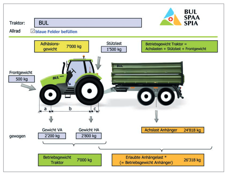 Bei einer Gesamtzugkomposition von 40 Tonnen müssen mindestens 8,8 t auf den Antriebsrädern des Allradtraktors lasten. Idealerweise überträgt dabei ein Starrdeichsel-Anhänger Stützlast auf die Verbindungseinrichtung des Traktors. Mit einer 80er-Kugel sind hier Stützlasten bis zu 4 t möglich. Mit einem Frontgewicht bekommt man die 20 % Lenkachs-Betriebsgewicht wieder in den Griff. Dabei müssen auch die maximalen Achsbetriebsgewichte (evtl. im Fahrzeugausweis ersichtlich) und der Reifen-Tragfähigkeitsindex beachtet werden.