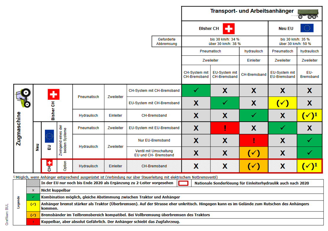 Die Astra-Weisung «Fahrzeugkombinationen mit hydraulischen Bremssystemen für land- und forstwirtschaftliche Fahrzeuge» beschreibt die Kombination H1L Traktor – H2L Anhänger. Die Weisung ist bis zum 31. Dezember 2025 befristet gültig und gilt nach diesem Datum als aufgehoben. Für das «alte» Zugfahrzeug bedeutet dies: