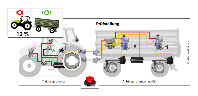 Mit der Prüfstellung kann beim Betätigen der Handbremse am Traktor ein Druckverlust in der Bremsleitung bei den Anhängern simuliert werden (Bremse am Anhänger wird gelöst). Somit kann sichergestellt werden, dass mit der Handbremse vom Traktor der Anhängerzug in einer Steigung oder einem Gefälle von 12 % gehalten werden kann (siehe Grafik).